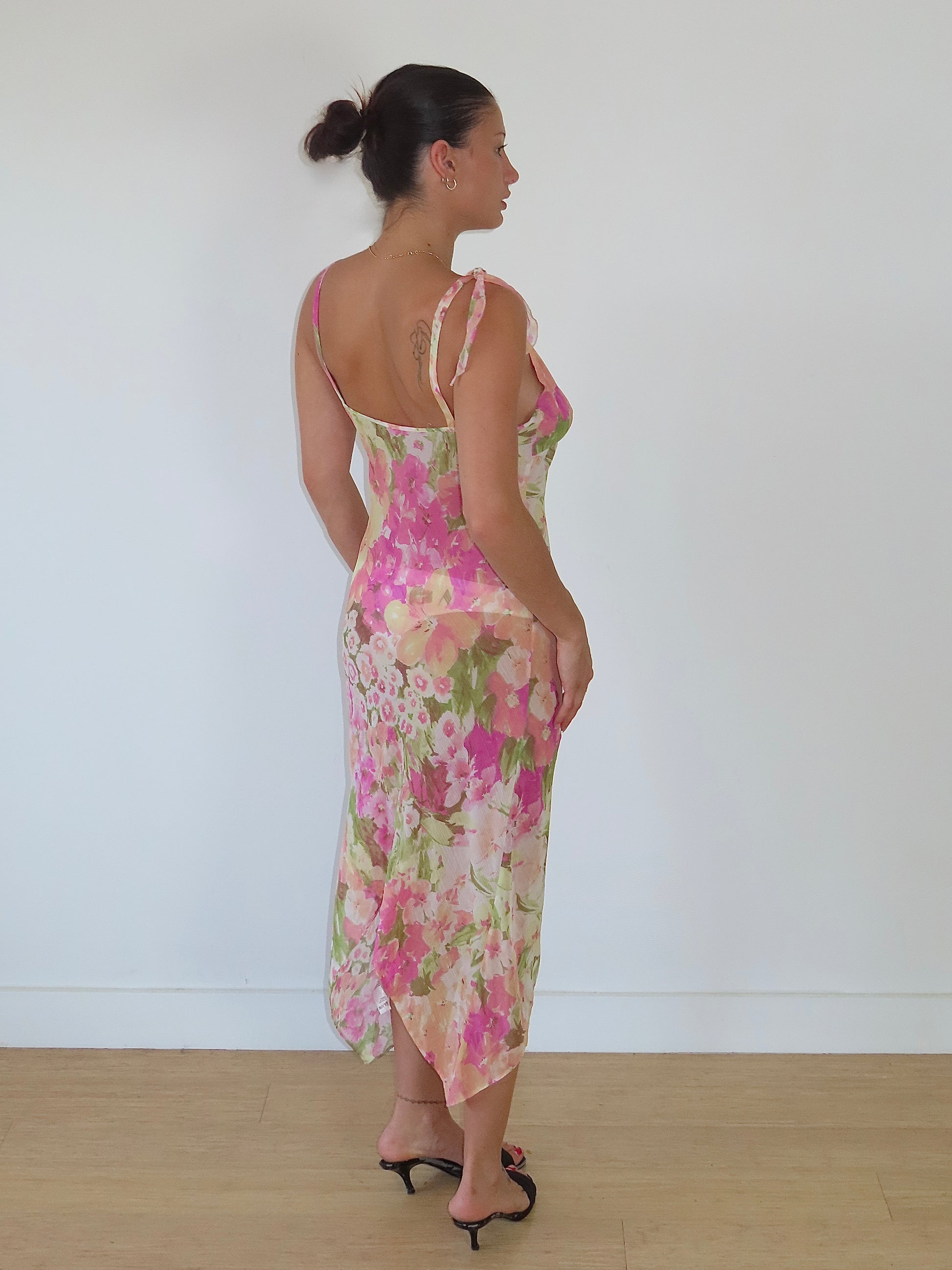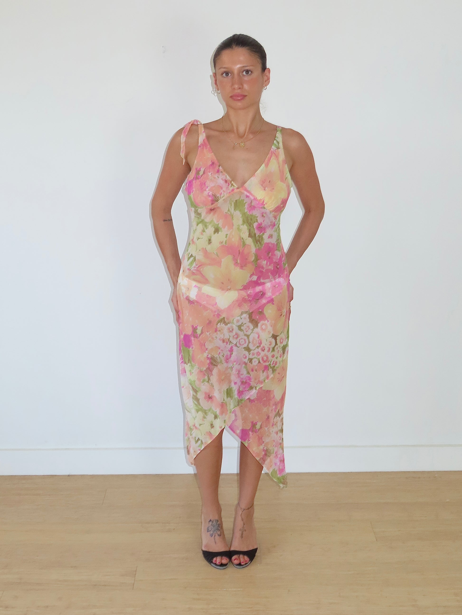 an incredible 2000s piece. fully sheer floral midi dress with asymmetrical skirt and tie strap.
